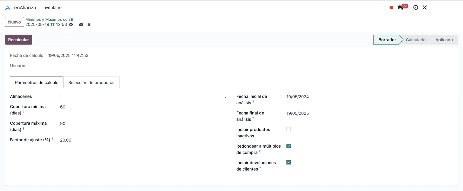 Ingrese los parámetros de cálculo: almacénes, coberturas mínima y máxima, factor de ajuste, período de análisis, calcular o no productos ináctivos, redondear a múltiplos de compra o considerar devoluciones de clientes.