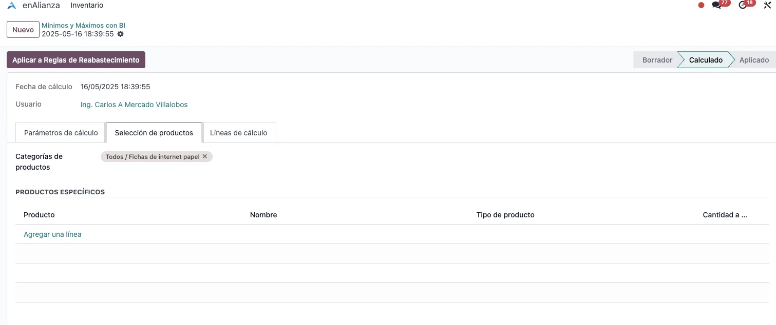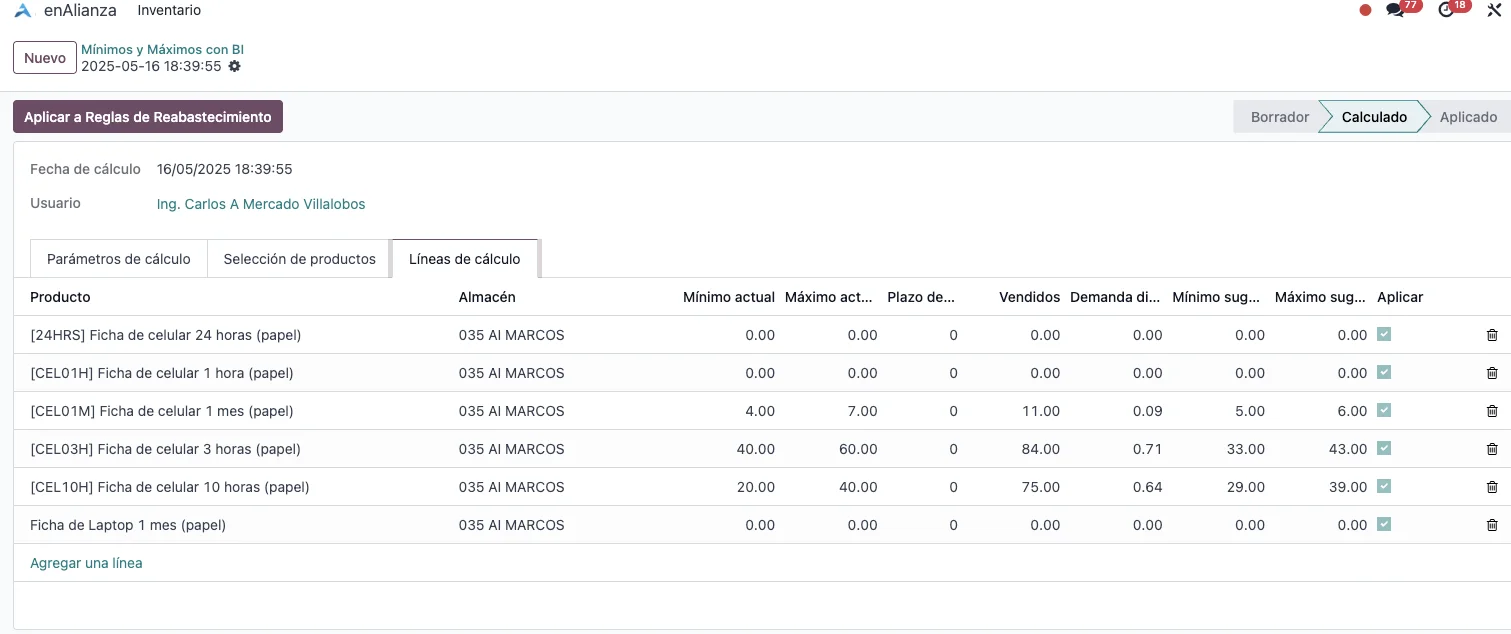 Nuestro módulo exclusivo para Odoo 18, al utilizar inteligencia de negocios (BI); te permite calcular de forma automática y precisa las cantidades mínimas y máximas de inventario basadas en ventas reales y tiempos de entrega de proveedores. Ideal para empresas que desean eficiencia, control y cero rupturas de stock.